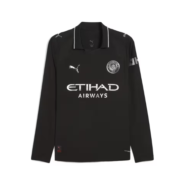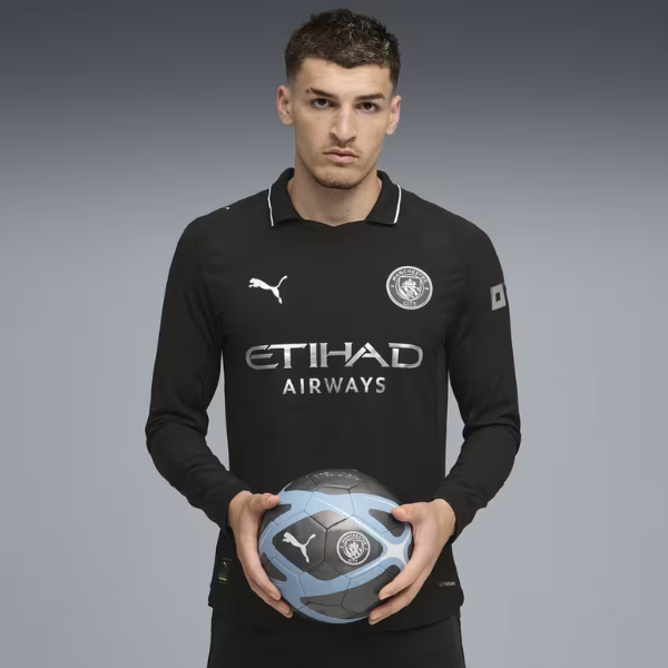 La toute première tenue de Manchester City remonte à 1884, lorsque le club de football était encore basé à Gorton. La tenue Away 25/26 rend hommage aux Cityzens de la première heure, sans faire l’impasse sur l’esprit d’innovation du club. Le look noir intégral s’inspire de cette tenue historique, et les détails métallisés célèbrent l’essence intemporelle du Manchester City Football Club.